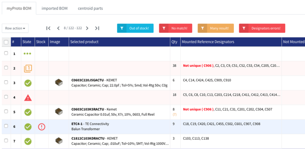 You have 5 status filters at your disposal on the myProto BOM editor: No match, Many results, Designators errors and Out of stock.